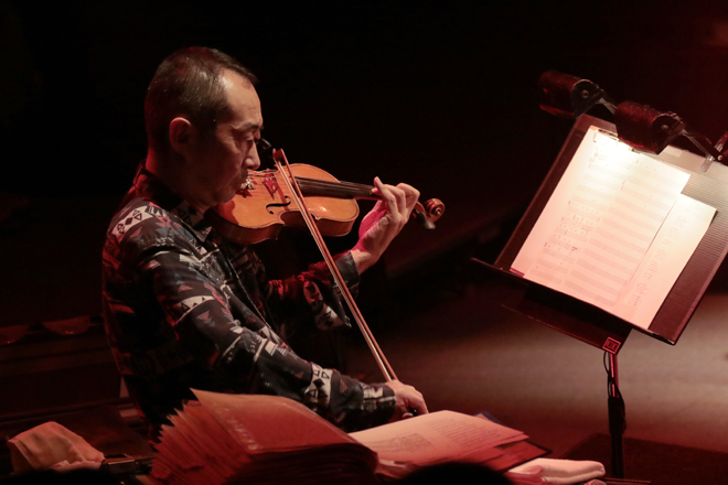 「MOON SONG」は、1987年リリースのアルバム『水玉時間』から。「やっと王道の曲が来た(笑)」と、ほっと一息の谷山浩子。どうやらオールリクエストにはマニアが多く、隙あらばレアな曲のレアなバージョンを歌わせようという、なにやら心理ゲームの色合いもある。続く「テングサの歌」も「“ひろコール”有りで」というマニアック指定つきで、歌詞の合間に「ひろこ!」とコールが入る昭和のアイドル仕様で。そうかと思えば次は「犬を捨てに行く」という、谷山浩子も思わず「すごい曲順だなー」とつぶやく、明るくシュールな民謡風→暗くシリアスな無常の歌へと急降下する展開は、通常のコンサートではありえないもの。それにしても「犬を捨てに行く」の斎藤ネコの熱演は鬼気迫るもので、毛を何本も切るほどの情熱的な弓さばきを、固唾を飲んで見守るオーディエンス。エモさで言えばこの日一番の快演だ。