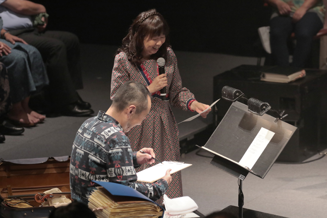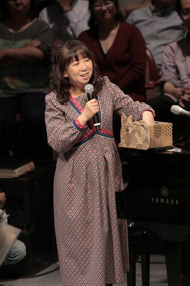 再び半券抽選スタイルに戻り、曲は「向こう側の王国」から「約束の海」へ。前者は2002年のアルバム『翼』から、後者は93年のアルバム『天空歌集』から。ここまで数えてみても、70年代、80年代、90年代、00年代、10年代とまんべんなく。それだけの長い時間、名曲を生み出し続けている谷山浩子もすごいが、すべての年代に名曲を発見するファンもすごい。つくづくこのオールリクエスト大会は、両者の思いが重なり合う大切な場所だという思いを新たにする。実はこのあと「鳥は鳥に」が続くはずだったが、思わず立ち上がって曲解説を始めてしまう谷山浩子。あっ!と気づいて曲に戻る前に、「今の曲で私は終わりました(笑)」。「約束の海」がそれほどに思いのこもった名唱であったことに加え、「鳥は鳥に」も素晴らしい歌唱だったことを合わせて書いておこう。ちなみに、斎藤ネコの前に置かれた「鳥は鳥に」の楽譜は栗コーダーカルテット用のパート譜だったらしく、頭の中でバイオリン譜に置き換え、弾き終えたあとでぼそっと「勉強になります」とつぶやく斎藤ネコ。素晴らしいを通り越して超人的だ。