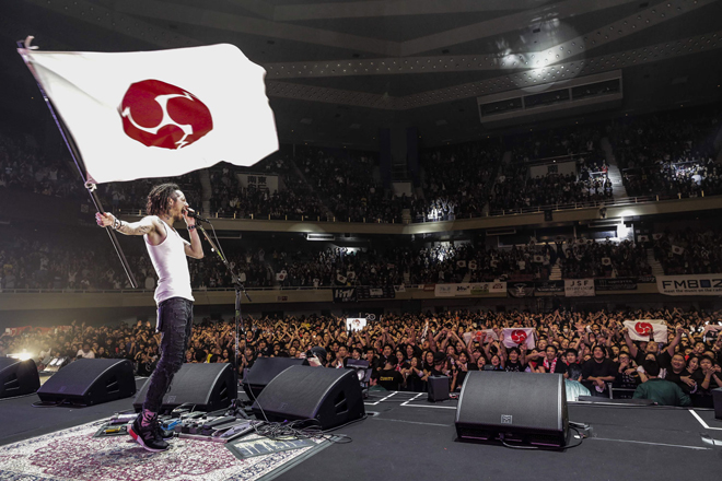 豪華ゲストとのコラボレーションはまだまだ終わらず、FIRE BALLを招きながらまさかの新曲を初披露したかと思えば、E.D.O.との共演による「火事と喧嘩は江戸の華」も炸裂。そうした躍動感あふれる展開のなかで、JESSEがアコースティック・ギターを奏でながら歌った「missing you」のせつなさも心に染みた。しかもその場で彼は、再婚と男児誕生をステージ上から報告。場内はそれまでの熱気とは違った温かな空気に包まれた。「heiwa」を歌った際に彼が口にした「何が良くて何が良くないのかなんてわかんない。子供たちにはもっとわかんない。だから、手助けしたい」という言葉には、デビュー当時の彼にはなかった父親の視線が感じられた。加えて、盟友Pay money To my Painに対する「俺たちを強くしてくれたのはP.T.P。あいつらを背負って一生、生きていく」といった彼の心情吐露には、観る者の心を揺さぶるものがあった。
