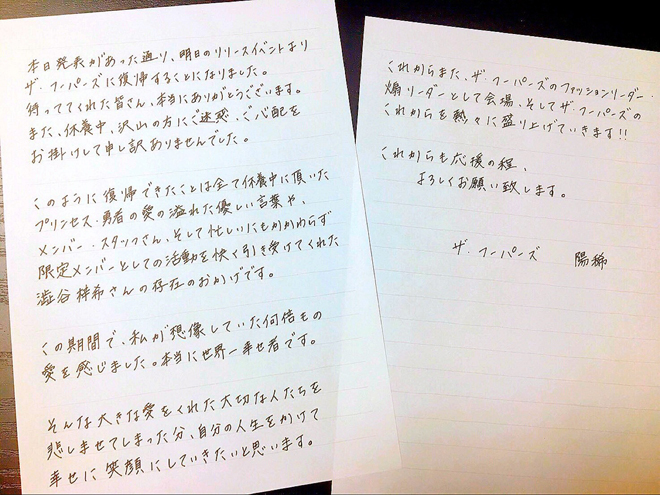 陽稀は「本当にご心配、ご迷惑をおかけしてすみませんでした。ただいま!」と挨拶。この日初めてザ・フーパーズのイベントに足を運んだという観客がいることを確認すると、「こうやって初めましての人と出会えたのは、急に俺が抜けてもメンバーががんばっていてくれた証拠だと思う。会いに来てくれてありがとう」と感慨深げに語った。