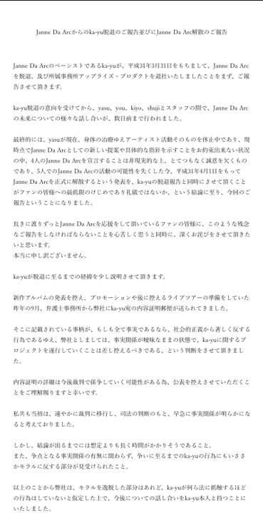 こうした状況の中でJanne Da Arcの未来についてメンバー、スタッフで話し合った結果、“4人のJanne Da Arcを宣言することは非現実的な上、とてつもなく誠意を欠くもの”という判断の上、平成31年4月1日をもってJanne Da Arcを正式に解散することになった。