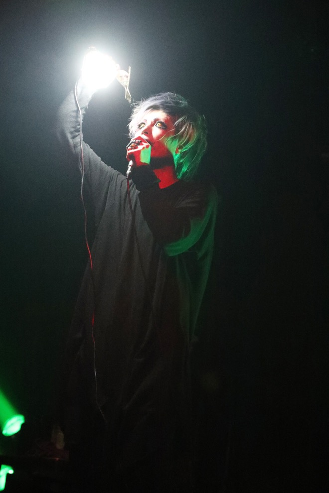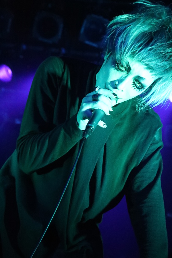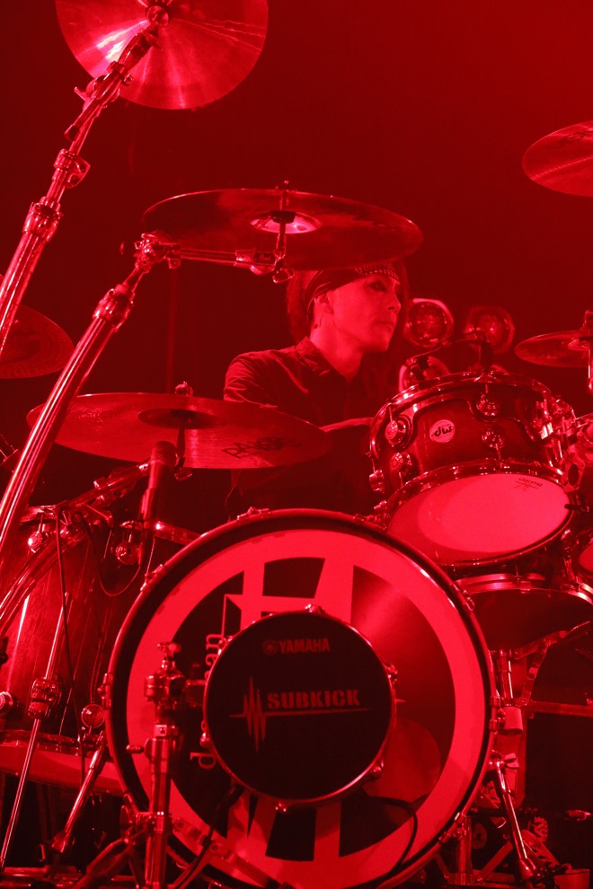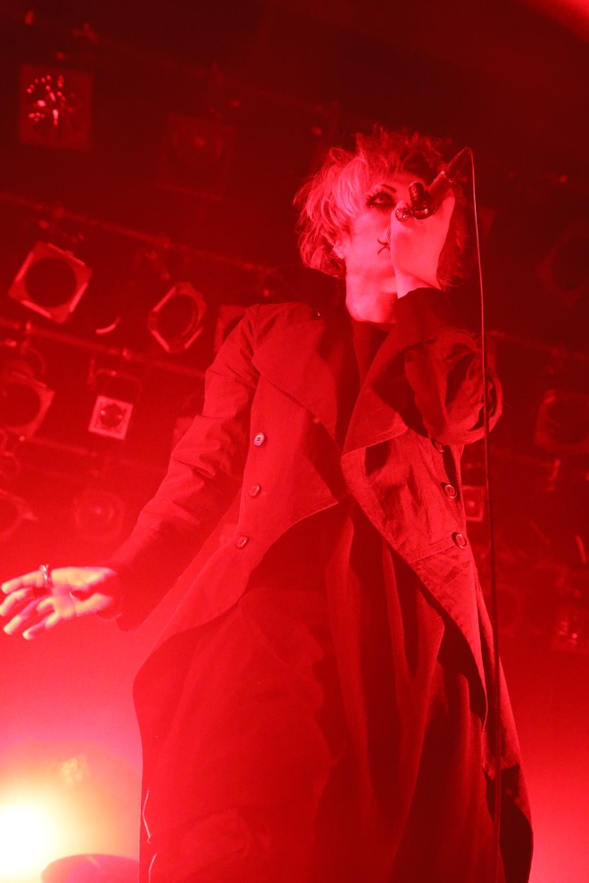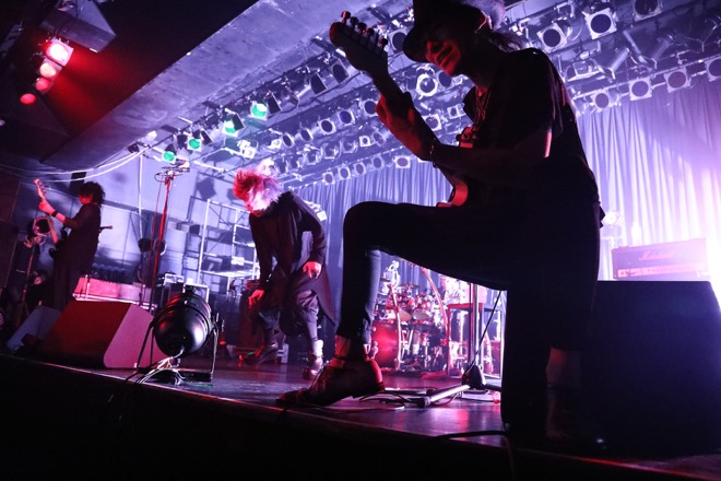 BGMがノイズと共に唸りをあげ、開演を告げる暴力的なダンスビートが場内を不穏に塗り替える。この定時ジャストというスタイルは彼らが長年積み上げてきたひとつのライヴの封切りの仕方だった。違うのは今夜ステージに立つメンバーのほう。オリジナルメンバーである眞呼とaieにメリーのテツ(B)とlynch.の晁直(Dr)をサポートに迎えた新編制で、見る人が見れば名古屋オールスターな装いである。