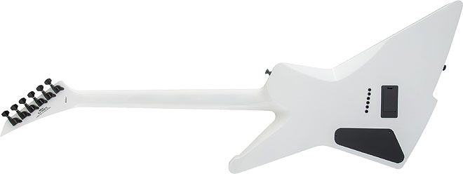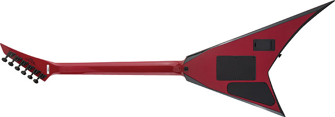 攻撃的なリバース・ヘッド・デザインのネックはグラファイトで強化された1ピース・メイプルのスルーネック構造。ボディのウィング材にはポプラを採用している。レッド・カラーのリバース・シャークフィン・インレイが施されたローレル・フィンガーボードはコンパウンド・ラジアス仕様で、どのポジションでも違和感のない弾き心地を実現。ピックアップは、アクティヴ・ピックアップのセイモア・ダンカン社製AHB-1B(リア)、AHB-1N(フロント)ハムバッキングをマウント。ブリッジには激しいアーミングにも対応する、フロイド・ローズ・スペシャル・ダブル・ロッキング・トレモロを装備している。ヘッドストックとネックに施したホワイト・バインディングがアクセントとなり高級感を演出している。