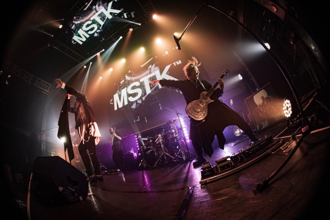 19時ちょうど。最先端の技術を駆使して創られたVJがブルーのライトに包まれたステージをクールに演出し、“MSTK™”のロゴがヴィジョンに映し出されると、ステージにスタンバイしていたAZ(G)、JIN(G)、O.N.Z.B(B)、Nosuke(Dr)によって1曲目に用意された「Under the Gate」が放たれた。初ライブにしていきなりの新曲投下とは、随分と強気である。しかし、光に満ちたその楽曲の壮大さは、ここから始まっていくプロジェクトを物語るかのように、そこに在るべき姿として見事にハマっていた。