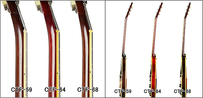 ネックグリップは、往年のグリップを再現するべく当時のネックシェイプを採寸した数値を基に成形。握り心地のよい太さが特徴の50年代後期。スリム過ぎず程よい厚みを持たせた演奏性の高い60年代中期。ナローで小ぶりながら安定感のある60年代後期。コンセプトとなる各年代ごとの特徴を捉えて製作されている。