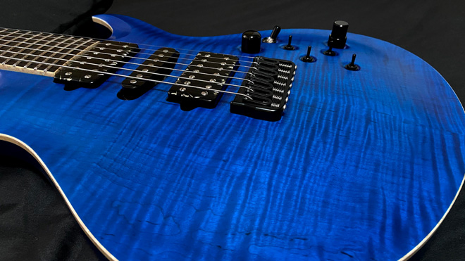 うわ、めっちゃカッコいい。というかめっちゃ美人。ヘッドにコンター的なカットが入っているのもバインディンがウッドなのも、そもそもアーチドトップでピックガードレスなのも美しい。ベア・ナックルPUもカッコいいし、こりゃ自慢の1機だ。細かなスイッチ類も機能的なんだろうなぁ。バック材はベースに使われそうなアッシュに見える。コンバット最高。(JMN統括編集長 烏丸)