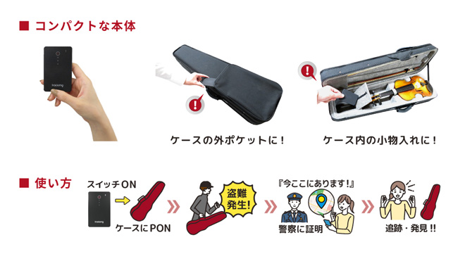 楽器から少しの間目を離すことは、どうしても避けられないことですが、楽器の紛失・盗難対策をすることは可能です。TRE GPSが提供する『楽器GPS』があれば、いつでも楽器の位置をリアルタイムで確認することができます。楽器GPSを活用して、楽器を安心・安全に持ち運びましょう。