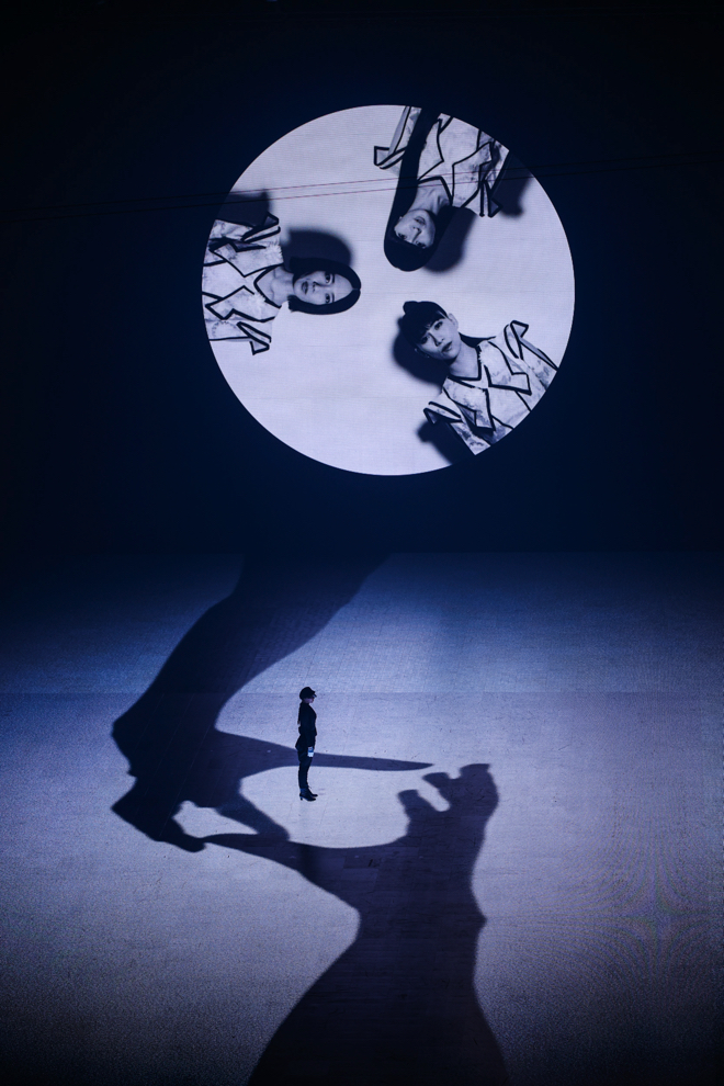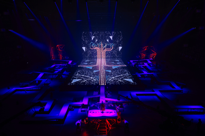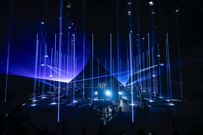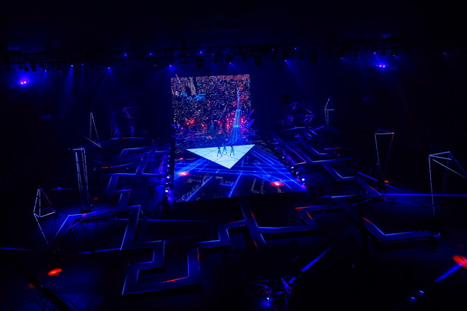徹底した感染予防対策のもと、着席で1万人のところを5千人にしての開催。それを逆手にとるように、アリーナ全体をステージにしていている。観客はU字型に設計された2階、3階、4階席から、ちょうど競技場のフィールドを見下ろすようなカタチだ。通常仕様のエンドステージもなく、ラップトップPCを90度に開いたように、観客から見て一番奥に大きなスクリーンパネルが立ち、そこから水平部分が縦長のアリーナに長く伸びている。マットな黒い板というイメージの非常に大きなステージ。縁を囲むようにジグザグの花道やライトタワーはあるものの、ステージから突出するセットやオブジェは見当たらない。つまり、パッと見何もない世界だ。