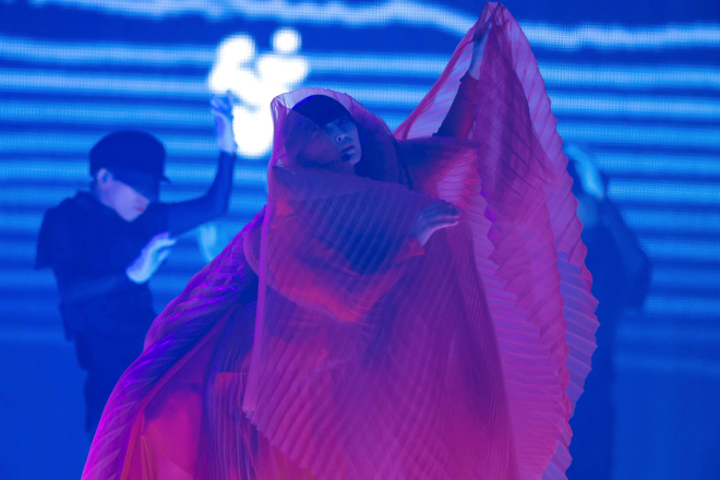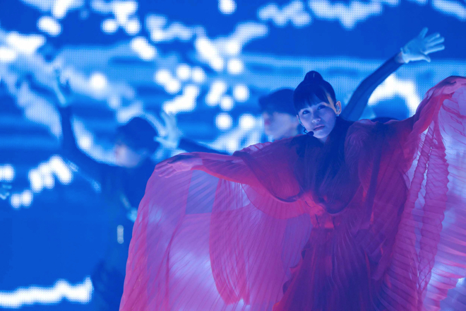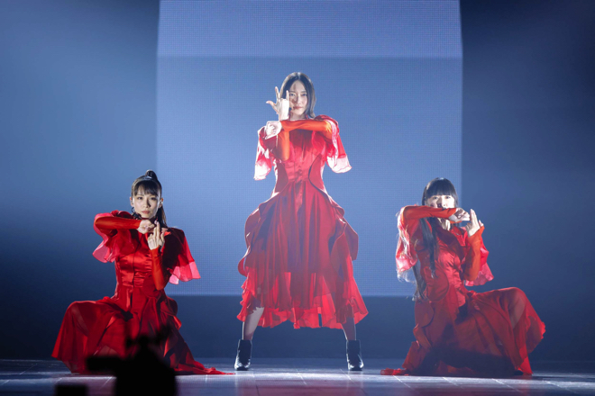 その象徴と感じたのが、中盤「マカロニ」からの流れだ。アイドル風の白いスタンド・マイクで歌う姿をセピア色のライトが照らし、その表情がレトロな雰囲気で映し出される。いつしか強い光が射し、ステージに3人のシルエットが伸び始めた。光源は複雑に交差し、影は前にも後ろにも。やがて3人が去ってもその影だけが意思を持ったように残る。まるで影に支配された世界。黒子のELEVENPLAYも加わり、声が奪われた世界で自らの存在を問うというまさにコロナ禍の現状が、声なきミュージカル風に描かれていく。ステージの3方には黒いマントを着た3人が現れ、不穏な空気を撃破するようにソロダンス。そして、「私は私になってゆく。今それを届ける」というナレーション。続いたのは「ポリゴンウェイヴ」だ。