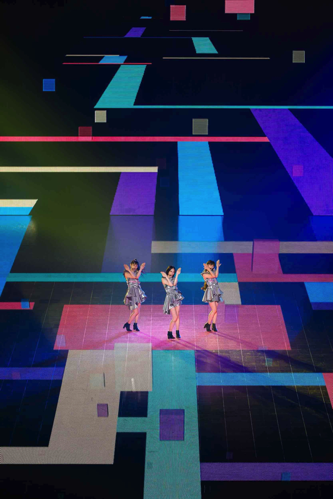 ここで特筆すべきは、カラフルなパネルを持った何人もの黒子ダンサーが現れたこと。Perfumeのデビュー時からずっと演出・振付を手がけているMIKIKO氏は、ドーム級のステージでさえ3人だけで見せることにこだわってきた。本人たちもそこを誇りにしてきたはず。3人以外の存在の登場は、だから、実に大きな変化なのだ。黒子という匿名的な存在のまま今回の世界観に寄り添う振付を完璧に踊るのは、MIKIKO氏率いるダンスカンパニーELEVENPLAYの面々。これまでも見えないところでPerfumeのステージを支えていた人たちだ。ふと、人力、共有、共生といった言葉が浮かんだ。