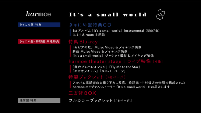 パッケージは初回限定盤と通常盤、きゃにめ盤の3形態で、三方背BOX仕様の初回限定盤ときゃにめ盤にはBlu-ray Discや48ページの特製ブックレットが付属する。特典Blu-rayには「セピアの虹」を含む2曲のミュージックビデオとメイキング映像、ジャケット撮影のメイキング映像、2021年11月に開催されたファンクラブイベント<harmoe theater stage I>からの4曲のライブ映像が収録される。特製ブックレットには、アルバム収録楽曲と撮り下ろし写真、中村彼方による物語で構成されたオリジナルストーリー「It’s a small world」が掲載されるそうだ。リリースの告知とあわせてティザー映像が公開された。