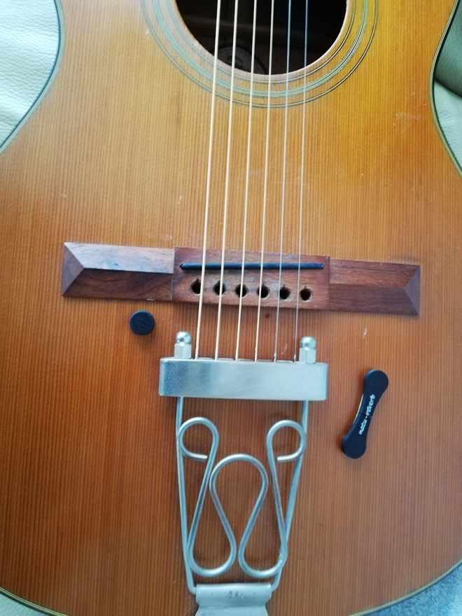 取付けてみると、この位置でもかなり残響音が大きいです。パーラー型のギターならウクレレ用で良かったかも知れません。リードを弾くにはとても良い感じです。ストロークで弾くと鳴り過ぎるので、これは弱めに弾けば良さそうです。コンプレッサをかけた様な感じで低音が小さめになります。