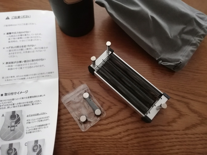 2個組のマグネットの水平が出ていないので、そのまま取付けると片方が浮いてしまいます。仕方ないので2つに割って解決。テイル・ピースにマグネットが付いてしまうので、取付場所が限定されますが、右手の邪魔にならないところにしてみました。心配なのでマスキングテープでぞんざいに補強。