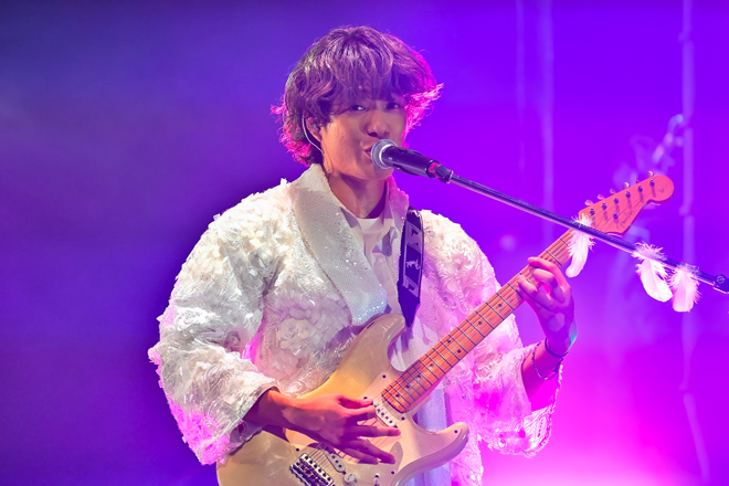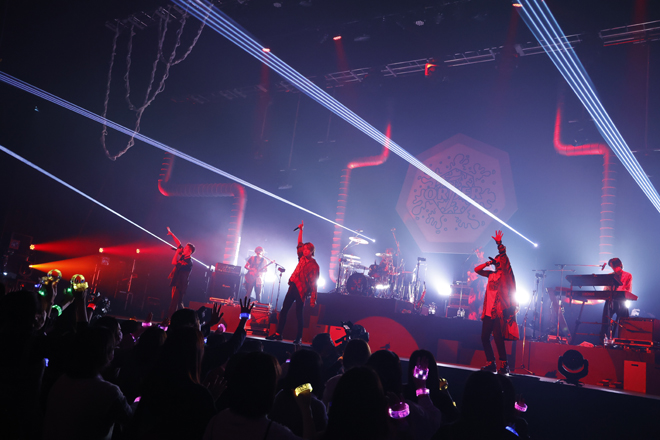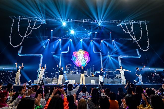 バンド、ダンス、トークに続いて、今度はアコースティックアレンジを施した演奏力で、会場を魅了していく彼ら。安井に「波職人」と紹介された長妻は、キーボードをレインスティックに持ち替え、レインスティックを左右に傾けながら波の音を演出。萩谷はドラムをスィールパンに替えて鳴らすなど、新楽器をフィーチャーした演奏で、「Ups & Downs」をゆったりとしたトロピックな新アレンジでプレイしてみせた。ゆったりとした空気が場内に広がったところに、いきなり真田のハードなギターリフが響き渡り、阿部がラップを勢いよく畳み掛け、次は「ONE」で熱量の高い、エネルギッシュなバンドサウンドへといっきに振り切る。そこから、疾走感ある「Get Gold」へ。この曲はメンバーの自作曲だけあって、7人の持ち前の演奏力とボーカル、ラップ、その魅力的な個性があちこちのパートでバーストする濃度高めのナンバーだ。全部が掛け合うように熱量を高めていくものだから、見ているだけで体にパワーがどんどんみなぎっていく。ここではギターを弾きながら歌う安井が“自由を求めて〜”と歌い上げ、全員の血が沸点まで沸き立ったところで、照明がダウン。バンドサウンドが同期演奏に切り替わり、再び照明がパッと明るくなった瞬間。7人が舞台中央で激しく踊り出した瞬間は鳥肌! さっきまであんなにバンドマンしていた人たちが、こんなにクールにカッコよく踊るなんて。バンドとダンス、1曲のなかに自分たちが発揮できる最大限の魅力を最大限ぶち込んで観せてやるというセンスと、それをやってのける力量に場内の興奮は当然マックスに高まっていった。ものすごいインパクトだ。