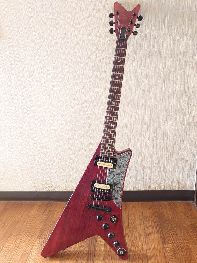 え?これ自分で作ったの?凄すぎる。しかもモダーンにしちゃうだなんて、違いの分かる男過ぎてしびれた。オクメ材ってよく知らないんですけど、マホとかコリーナ系にみえてかなり良さげ。張り合わせがセンターじゃないところが可愛いけど、それよりネックのメイプルもチェリー~ウォルナット的色合いに揃っているところに男の美学をみた。もしかしてスカーフジョイントも自分でやったんすか?指板張り替えなんて高難度なことをさらりとやってのけていることをみても、恐ろしい達人だなあ。インスタントコーヒーを嗜む時点で、違いの分かる男がすぎるというものです。(JMN統括編集長 烏丸)