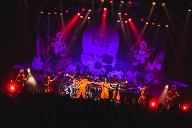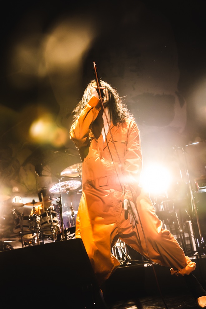 ロックサウンドから一転、HIP HOPグルーヴへ変化して「TATTOO」での逹瑯の鋭いラップがバシバシと刻まれる。そしてBPMがほぼ同一に近い「DYSTOPIA」へと繋げる絶好のミドルテンポの展開で魅せ、客席はオールハンズアップの多幸感あふれる光景が広がった。さらに、ソリッドかつテクニカルなメインフレーズが印象的な「エンドロール」と畳み掛け、逹瑯の情熱的な歌唱が力強く、深く鳴り響く。開始5曲でフロアは生命力あふれる逹瑯とメンバーのライヴエネルギーで満たされていた。