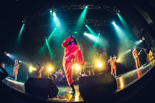青の照明の閃光に包まれつつテンポアップし、逹瑯は情念たっぷりに歌い上げ、序盤から早々にライヴのテンションを高める。そして「1周年パーティーへようこそ!」という逹瑯の挨拶に続き、ステージに招き入れられたのは、ゲストヴォーカリストのガラ(メリー)。ウサギの被り物をしたガラがギターリフに乗り、軽快にステップを踏みつつ「CRASH MAN」へ。息の合ったコンビネーションで逹瑯とガラが交互にヴォーカルをとり、オーディエンスの一斉のクラップが重なって、燃え上がるようなヴォルテージでライヴを走らせる。2人のハーモニーもビシッと決まり、けたたましいロックサウンドと共にフロアは興奮の渦に包まれる。