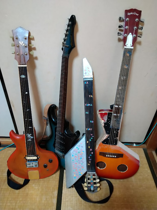 前の投稿で「15年前に左手首を大怪我して普通のギターが弾けなくなった」ことからフレットレスギター中心のギター人生になったとありましたが、改造ポイントの大きな特徴に右カッタウェイが極端に深い点が挙げられますよね。指板もブリッジまで伸びているし。スティックみたいに通常のギターとは全く違う奏法なのかな。しかもフレットレス。謎が深すぎます。(JMN統括編集長 烏丸)