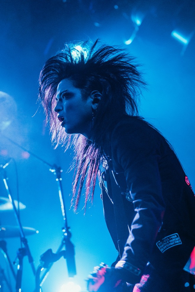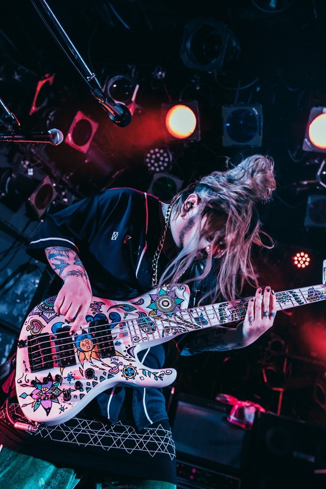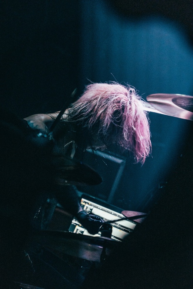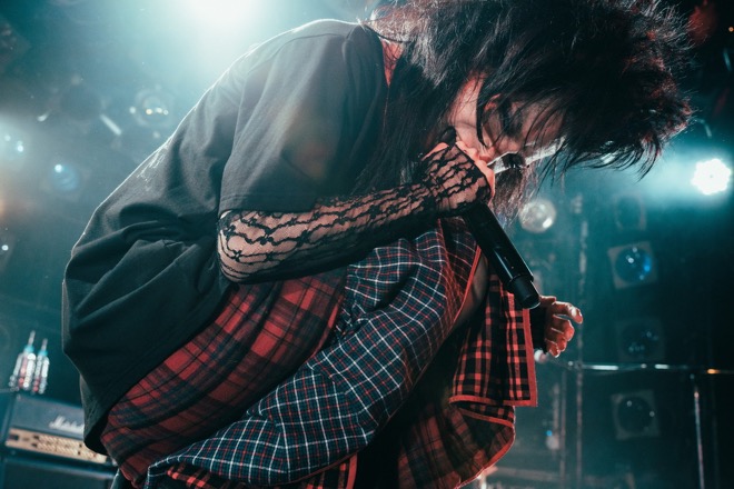 チケットはソールドアウト。週初めの月曜日にもかかわらず、フロアは満員だ。暗転後、SEのない無音の空間にメンバーが登場すると、大きな歓声と拍手が沸き起こる。“生まれてしまったことがもう間違いだ”というフレーズから始まる「Dark In Black Hole」でライヴは幕を開けた。生きる苦しみと絶望を音に込めて発散するように、滑り出しから爆音を轟かせる。そんな彼らに共鳴するよう、観客たちもイントロから思い切り頭を振っていた。
