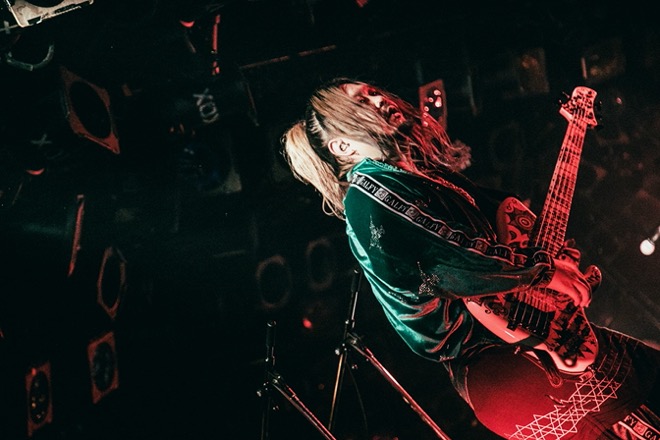 バンドマンとして、そして表現者として、あまりにも誠実な言葉だった。その言葉に精一杯応えるよう、観客たちは真っ直ぐにステージを見つめながら4人の音に聴き入る。言葉で刺したあとは、音で心を震わせる「神経と重力」へ。高く跳んだり自由に回ったりとアクティヴに動き回りながらギターをかき鳴らすMiyako。キーボードとコーラスも器用にこなすSacchan。そしてすさまじい雄叫びを上げながら重たい音でリズムを刻むSORA。盛り上がりのピークが延々と続くような爆発力で、フロアを圧倒した。