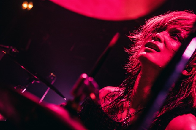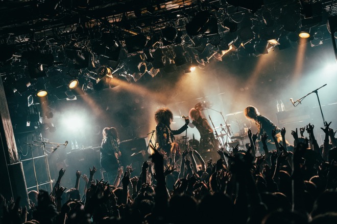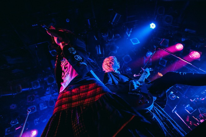 不協和音が響く中、ステージを照らすライトが真っ赤に変わると「「誤解」」が始まり、会場の空気が張り詰める。ダウナーかつ緊張感のある独特の雰囲気は、DEZERTのライヴならではだ。続く「バケモノ」は対照的に疾走感のあるキャッチーな曲。先ほどまでの重たい空気がガラリと変わり、観客たちは「オイ! オイ!」と声を上げながら拳を突き上げる。千秋(Vo)は、Miyako(G)やSacchan(B)の元へ順番に近づき、メンバーをも煽るような仕草を見せた。すると、「Thirsty?」では、2人がお立ち台に乗ってフロアを扇動。後方でSORA(Dr)も全身の力を叩きつけるような激しいドラムプレイを見せ、ステージとフロアが一緒に熱を高め合っていく。