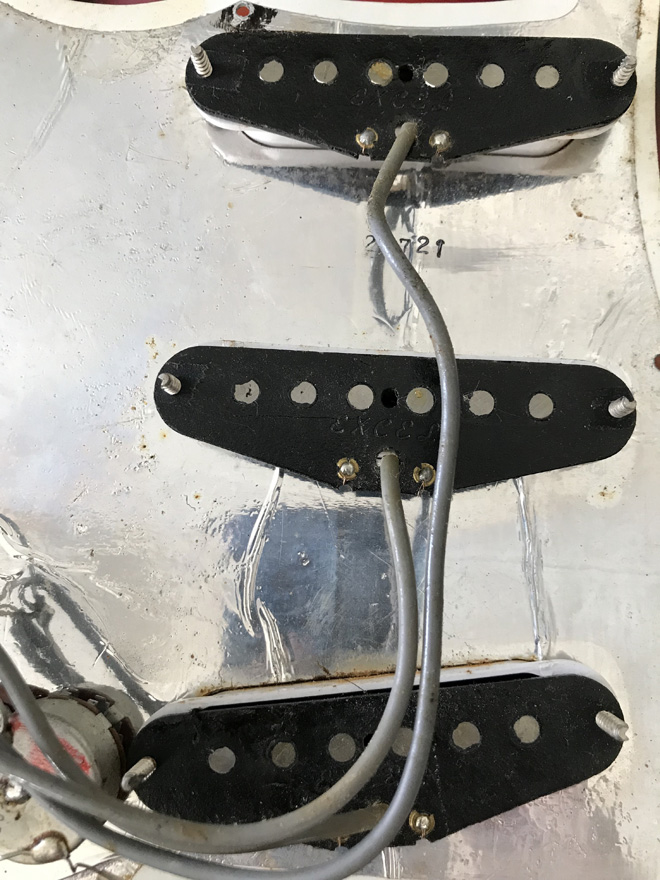 ジャンクの理由は音が出ない。との事だったもののポットとジャックの接点不良が原因で、PUは無事に生きておりました。さっそく、VoポットをCTS製 GZ-CTS M300A、ピックガードを手持ちのアノダイズド8穴に、トレモロのバネはRawVintageのrvts-1に交換しました。