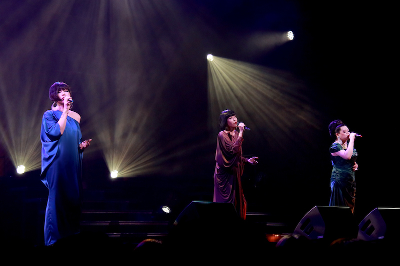 インタールードを挟んで3人がシックなドレス(といってもキラキラな生地)に着替えて披露されたのは『新宿EP』(2019年)に収録されている振り付けもインパクトのある「お姉さんポルカ」。チェコ民謡とシャンソンと歌謡曲が混ざり合ったようなレトロで妖しい世界観が各自の個性を引き出し、吸い込まれずにはいられない。