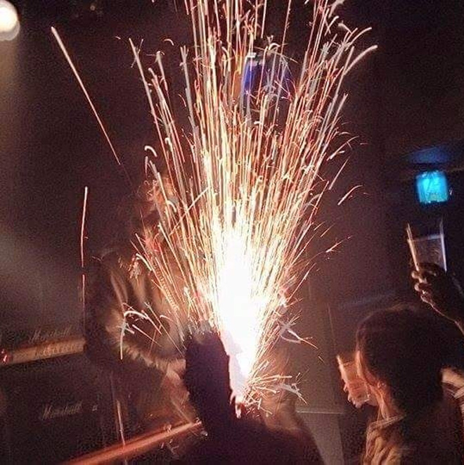 スイッチオンでモーターノイズが歪み系と空間系エフェクターに絡んでお客さんは何の音だか分からず。そこに急に火花が散る。そんな感じです。