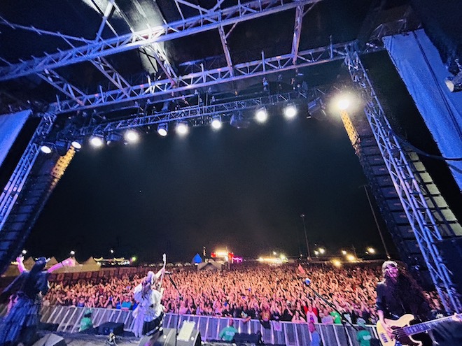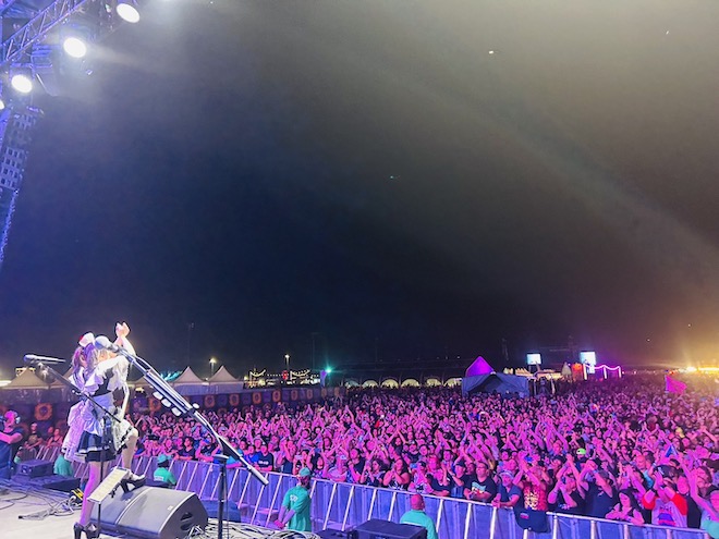 Bad weather proved no match for BAND-MAID, and when they set foot on the Rockvillian Stage it was to the delighted cheers of the fans awaiting them. Like in the Houston and Austin shows, they opened with “DOMINATION”, followed at a rapid tempo by “One and only” and “Blooming” for a charming performance that had every fan straining to get closer. The audience grew larger with every song as festivalgoers were drawn by BAND-MAID’s presence and music, filling the space in front of the stage and spilling out onto the walkways between stages until the whole area was blanketed with BAND-MAID lovers. “endless Story”, performed as the closing number of their last two shows, was #3 in the set list this time, and even in an audience full of first-time music festival participants, a sing-along broke out.