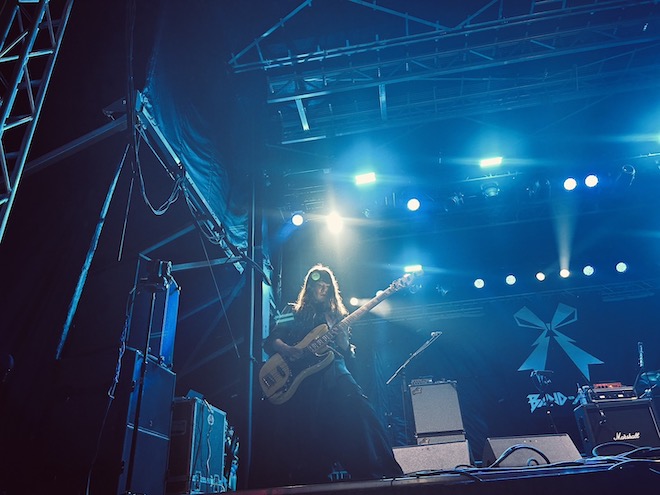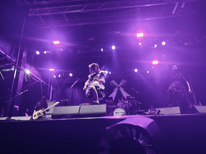 The day began under cloudless blue skies, but the weather took a turn for the stormy that evening, making it necessary to evacuate an area around the stage that included the waiting audience. Originally scheduled to play in the early evening, BAND-MAID waited out driving wind and rain and were finally able to start their performance at 8:50 PM, about two hours later than scheduled.