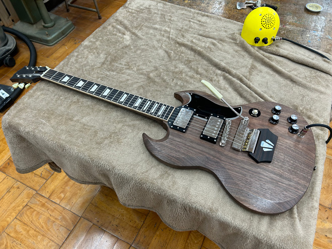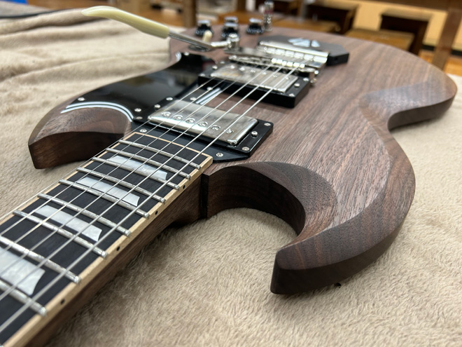 ボディ、ネックがウォルナット(テーブルを作っている木材屋さんで手に入れました)、指板がエボニー、ネックバインディングがメイプル、ショートバイブローラという構成で、1962年製のSGの形を目指して製作しました。エボニーブロックと彫りの深いベベルトコンターがポイントです!