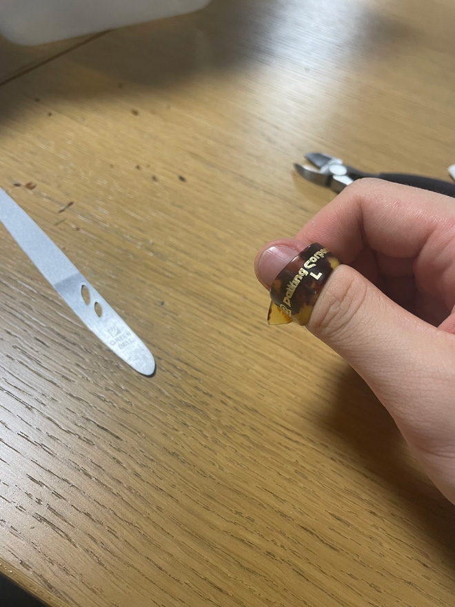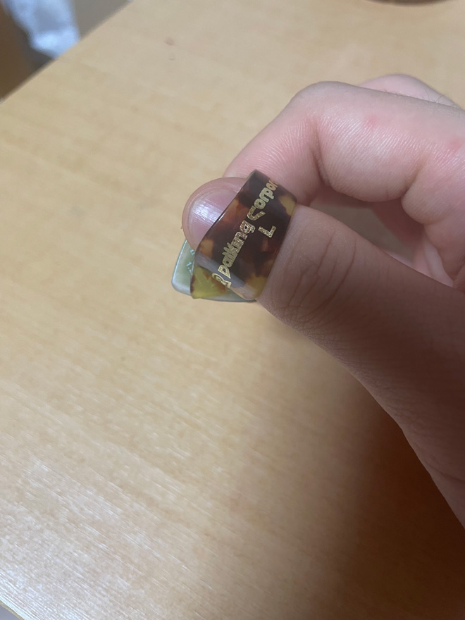 というわけでして最近サムピックを使って練習するようになったんですよ。ただ一つ問題点がありまして、サムピック、でかいんですよ。ギタリストの皆さんはお分かりかと思いますが、普段ピックを持つと親指から大体5mmくらいピックの先が出るじゃないですか。しかしながらサムピックって大体1cm出てるんですよ。これが弦に引っかかってしょうがない。なので鋏みたいな爪切りと爪ヤスリでなんとか加工して、はみ出る長さを通常のピックと同じくらいまで加工しました。