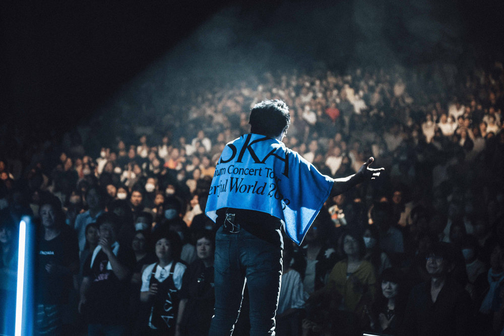 大自然の映像とインスト曲「Touch the earth」に続いて、海や空を連想させる青いジャケットを身にまとったASKAが登場。エモーショナルなフェイクで「Trip」が始まると、大きな歓声が起こった。幻想的な音楽の旅へと誘うような始まり方が鮮やかだ。ASKAの歌声の伸びやかさ、艶やかさ、力強さは驚異的だ。今もなお“伸びしろ”があるなんて、一体どんな喉をしているのだろうか。