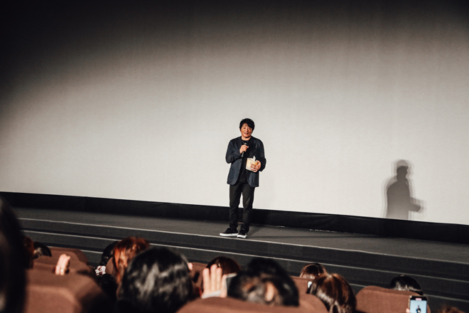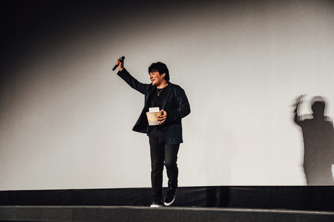 上映終了と同時にASKAがスクリーン前のステージに登場。その瞬間に悲鳴にも似た大きな歓声と拍手が起こった。「幕張でオープニングの舞台挨拶をし、その後、豊洲に移動して楽屋で聴いていました。今回の試みは計画性がありません。瞬間瞬間におもしろそうだと思ったことをやってみたら、そこで違う景色が見えてきて、じゃあ次はこれをやろうというになり、そこでまた違う景色が見えてきたら、次にやりたいことを出てくるのが僕の活動スタイルです。コンサートはコンサートで、映画は映画でありだなと思いました」とASKA。