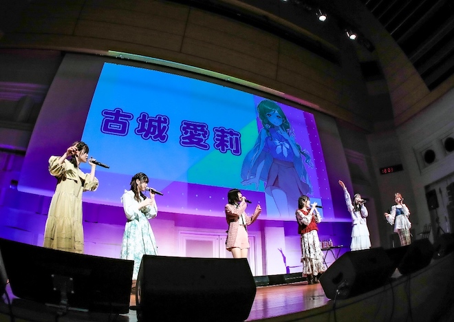 前回イベントよりも収容規模が大きくなった会場を埋め尽くすほど集まったミルふぁむ(『うたミル』ファンの呼称)たち。アニメ化も控える中、その膨らんだ期待を受け止めるべくステージにキャスト6名(綾瀬未来/小牧嬉歌役、夏吉ゆうこ/繭森結役、須藤叶希/古城愛莉役、松岡美里/近衛玲音役、花井美春/宮崎閏役、相川遥花/熊井弥子役)が登場すると、「うたごえハイシックス」から幕が上がる。大モニターに映し出された映像には、各キャラのソロパート時にあだ名が表示される演出もあり、アカペラをじっくりと聴いているミルふぁむたちもここぞとばかりに名前をコールする。2曲目には、昨年11月にリリースされたばかりの2ndシングル「POPPIN’ TIME」を弾むように初披露し、リズムに合わせて流れるリリックとともに視覚と聴覚で楽しめる空間となった。