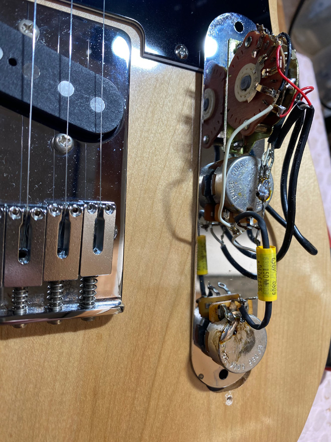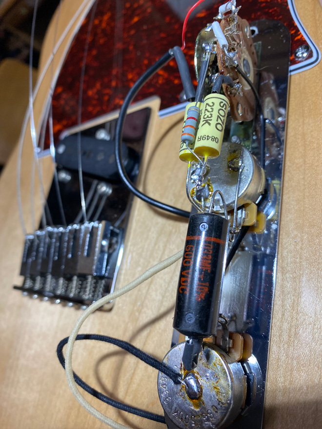 オールローズネックにソフトメイプルチェンバードボディーで、コンデンサーも0.022×2と0.033×1と独自な仕様の自作と、メイプルネックに単板ボディーのコンデンサーが0.047×3のエクスワイヤーとは基本的に違いますが、コレで中々良い感じなギターになっちゃいました。世界にそうそう無いであろうエクスワイヤーになりました~。